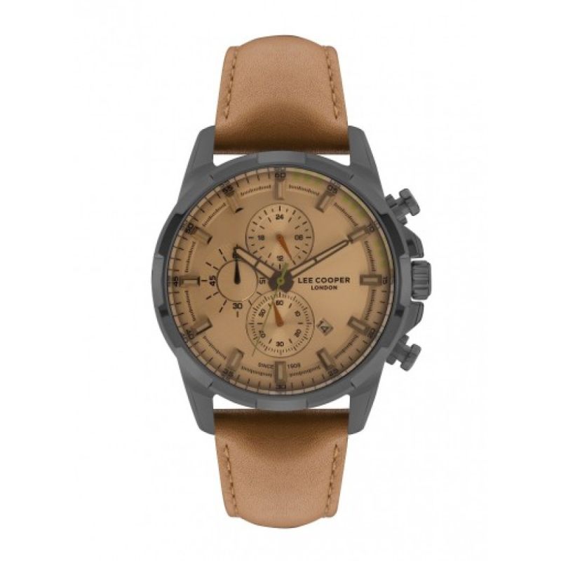 Спортно-елегантен мъжки часовник Lee Cooper. Моделът е с цветно стъкло и кафяв дисплей тип хронограф. Корпус от супер метал. Кафява кожена каишка. Задвижва се от кварцов механизъм. Водоустойчивост 3 ATM - допускат се леки пръски, не се препоръчва обилно мокрене.