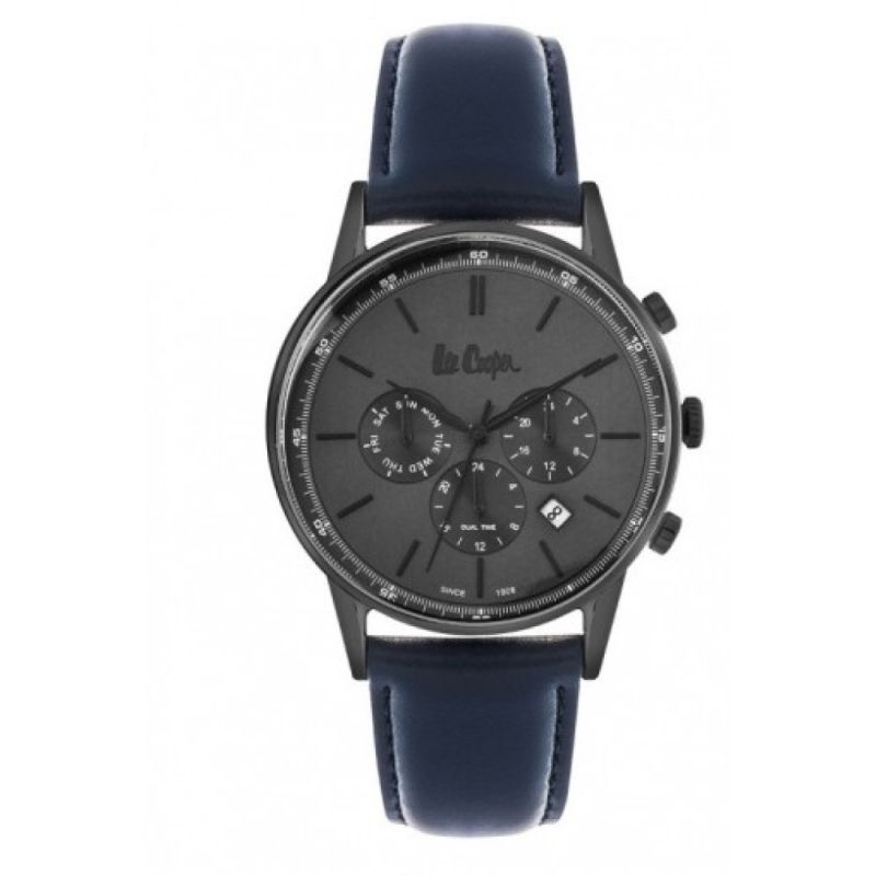 Елегантен мъжки часовник Lee Cooper от колекцията Classic Dual Time. Моделът е с мултифункционален дисплей с показатели за дата, ден и двойно време. Корпус от супер метал. Тъмносиня каишка от естествена кожа. Стъкло минерал-кристал. Задвижва се от кварцов механизъм. Водоустойчивост 3 ATM - допускат се леки пръски, не се препоръчва обилно мокрене.