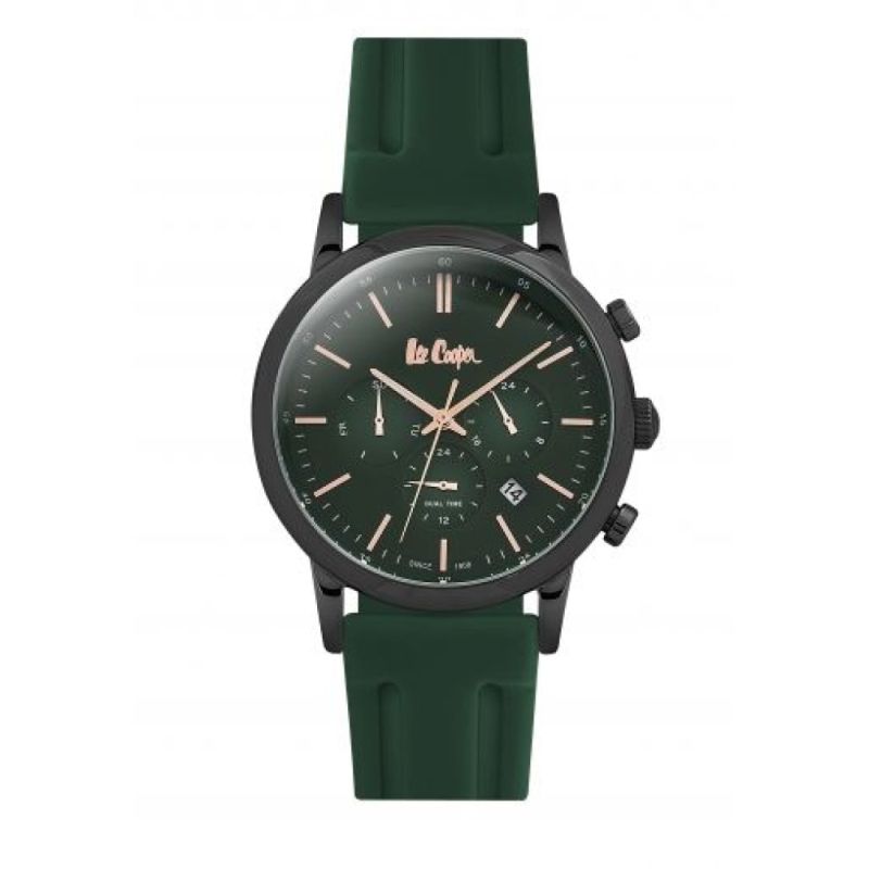 Мъжки часовник Lee Cooper от колекцията Classic Dual Time. Корпус от супер метал и стъкло минерал-кристал. Тъмнозелена силиконова каишка. Мултифункционален дисплей с показатели за дата, ден и двойно време. Задвижва се от кварцов механизъм. Водоустойчивост 3 ATM - допускат се леки пръски, не се препоръчва обилно мокрене.