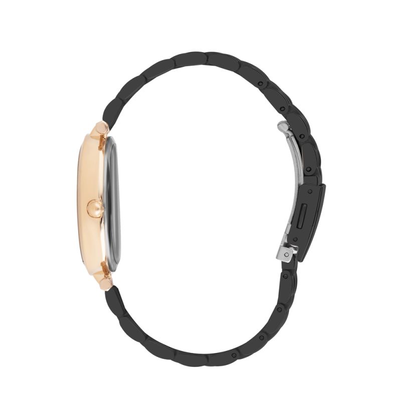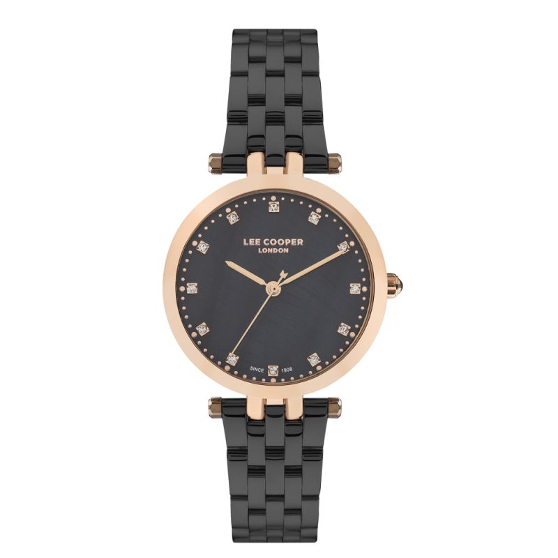 Елегантен дамски часовник Lee Cooper. Моделът е с корпус изработен от специална сплав - супер метал и има минерално стъкло. Черна метална верижка. Аналогов дисплей с декорация от инкрустирани кристали. Задвижва се от кварцов механизъм. Водоустойчивост 3 ATM - допускат се леки пръски, не се препоръчва обилно мокрене.