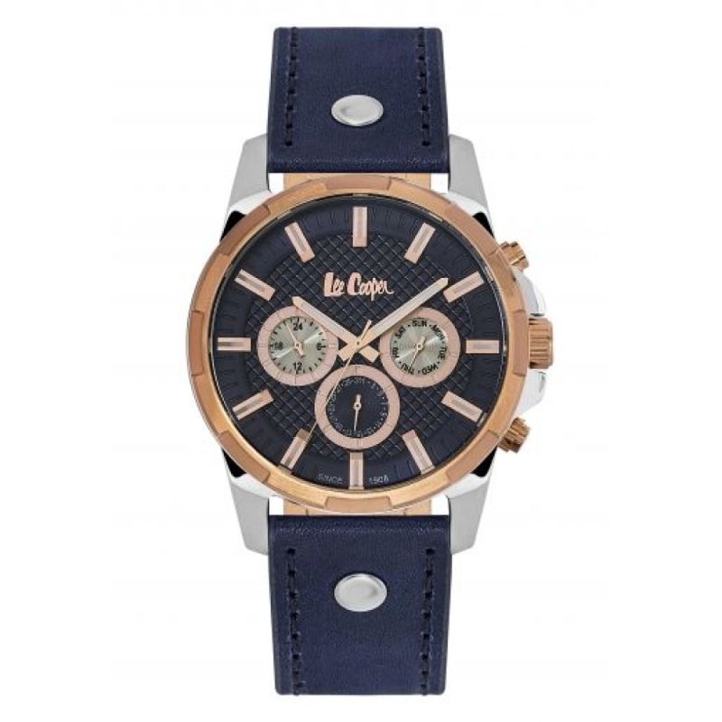 Мъжки спортно-елегантен часовник Lee Cooper със син мултифункционален дисплей. Корпус от супер метал и стъкло минерал-кристал. Каишка от естествена кожа. Кварцов механизъм. Водоустойчивост 3 ATM - допускат се леки пръски, не се препоръчва обилно мокрене.