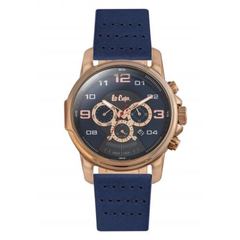 Спортно-елегантен мъжки часовник Lee Cooper от колекцията Classic Dual Time. Корпус от супер метал и стъкло минерал-кристал. Синя кожена каишка. Моделът е с мултифункционален дисплей с показатели за дата, ден и двойно време. Задвижва се от кварцов механизъм. Водоустойчивост 3 ATM - допускат се леки пръски, не се препоръчва обилно мокрене.