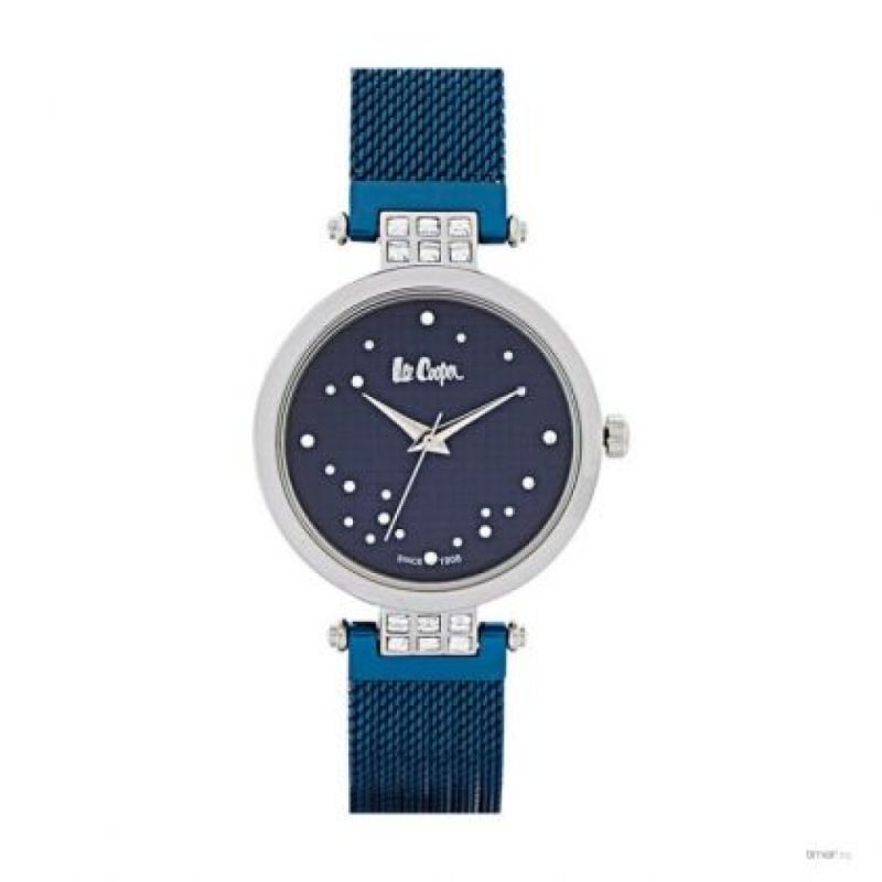 Дамски часовник Lee Cooper от колекцията Elegance. Верижка от неръждаема стомана. Корпус изработен от супер метал. Стъкло минерал-кристал. Аналогов дисплей в син цвят с геометрична основа и нежни кристали. Моделът се задвижва от кварцов механизъм. Водоустойчивост 3 ATM - допускат се леки пръски, не се препоръчва обилно мокрене.