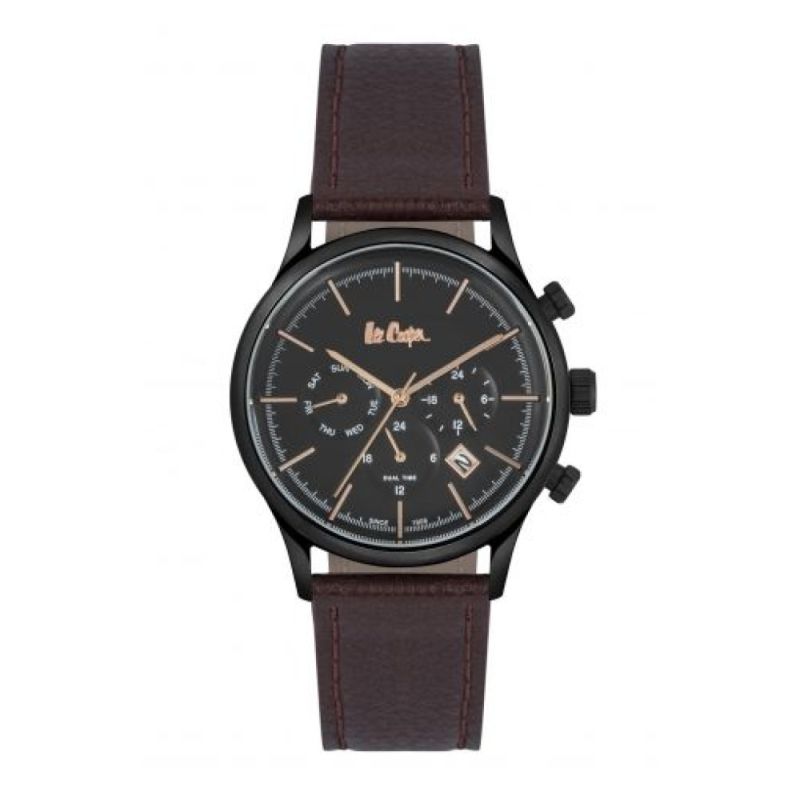 Елегантен мъжки часовник Lee Cooper с черен циферблат с розово-златисти стрелки и индекси. Моделът е с корпус от супер метал и стъкло минерал-кристал. Кафява каишка от естествена кожа. Задвижва се от кварцов механизъм. Водоустойчивост 3 ATM - допускат се леки пръски, не се препоръчва обилно мокрене.