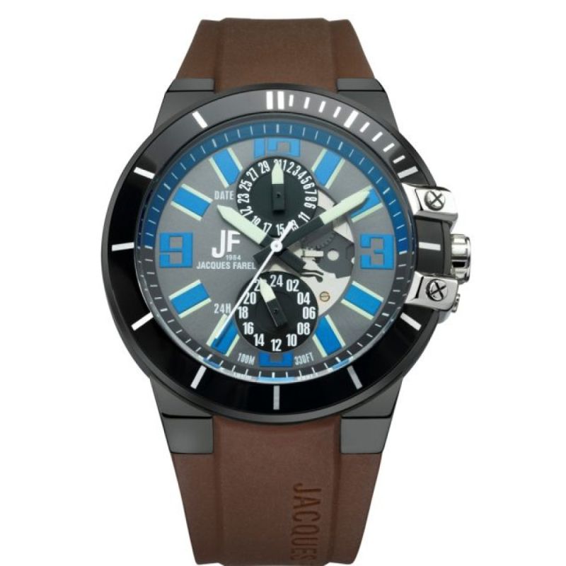 Мъжки спортен часовник Jacques Farel с мултифункционален дисплей. Моделът е с корпус от неръждаема стомана и кафява силиконова каишка. Минерално стъкло с антирефлексно покритие. Кварцов механизъм. Водоустойчивост 10 ATM - позволява мокрене, къпане и плуване във водни басейни.