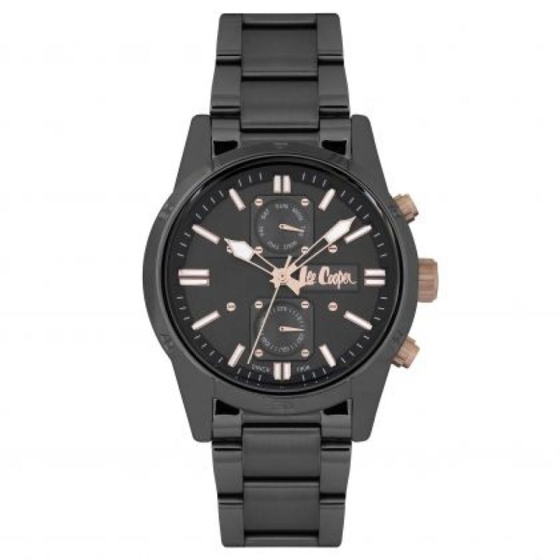 Спортен модел мъжки часовник Lee Cooper от колекцията Classic Multifunction. Корпус и верижка от супер метал. Стъкло минерал-кристал. Мултифункционален дисплей с показатели за дата и ден. Задвижва се от кварцов механизъм. Водоустойчивост 3 ATM - допускат се леки пръски, не се препоръчва обилно мокрене.