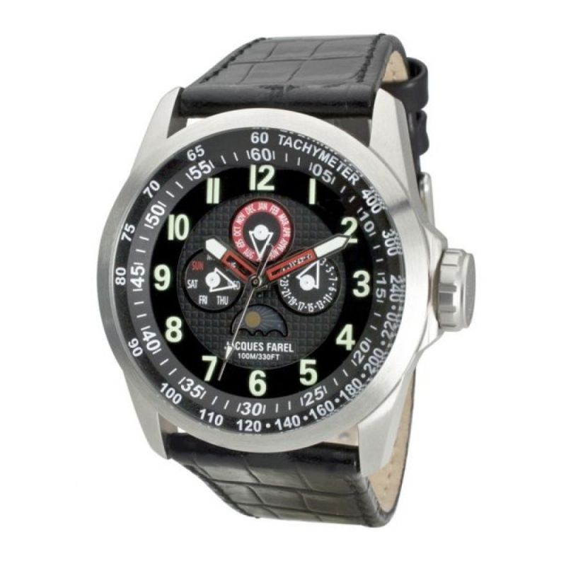 Мъжки спортно-елегантен часовник Jacques Farel. Моделът е с корпус от неръждаема стомана и черна каишка от естествена кожа. Минерално стъкло с антирефлексно покритие. Мултифункционален дисплей с показатели за дата, ден от седмицата и месец. Кварцов механизъм. Водоустойчивост 10 ATM - позволява мокрене, къпане и плуване във водни басейни.