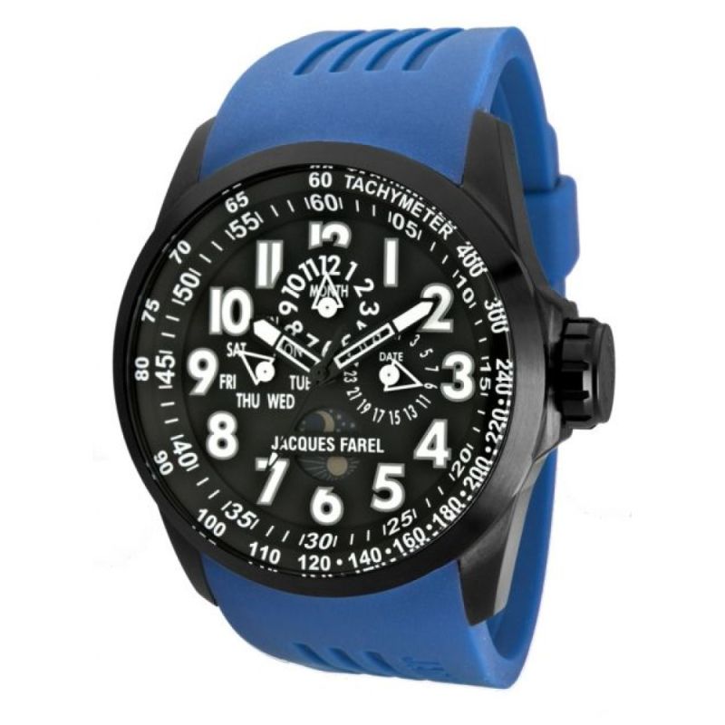 Мъжки спортен часовник Jacques Farel с мултифункционален дисплей. Моделът е с корпус от неръждаема стомана и синя силиконова каишка. Минерално стъкло с антирефлексно покритие. Кварцов механизъм. Водоустойчивост 10 ATM - позволява мокрене, къпане и плуване във водни басейни.
