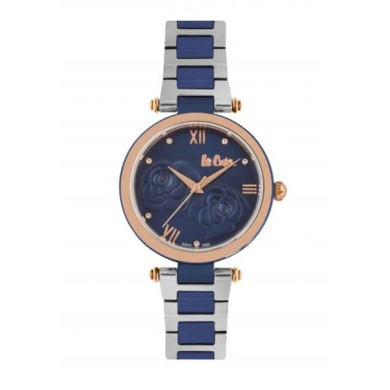 Елегантен дамски часовник Lee Cooper с модерна визия. Корпус и верижка изработени от супер метал. Стъкло минерал-кристал. Тъмносин аналогов дисплей с флорална декорация и нежни кристали. Задвижва се от кварцов механизъм. Водоустойчивост 3 ATM - допускат се леки пръски, не се препоръчва обилно мокрене.