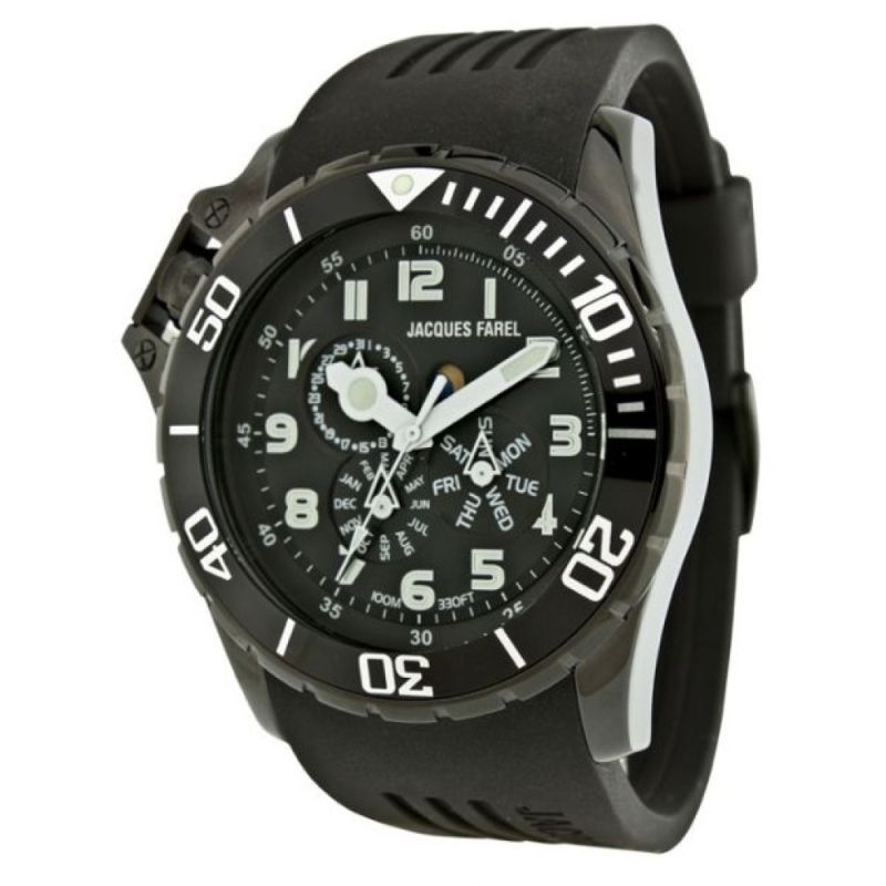 Мъжки спортен часовник Jacques Farel. Моделът е с корпус от неръждаема стомана и черна каишка от висококачествен силикон. Минерално стъкло с антирефлексно покритие. Мултифункционален дисплей с показатели за дата, ден от седмицата и месец. Кварцов механизъм. Водоустойчивост 10 ATM - позволява мокрене, къпане и плуване във водни басейни.