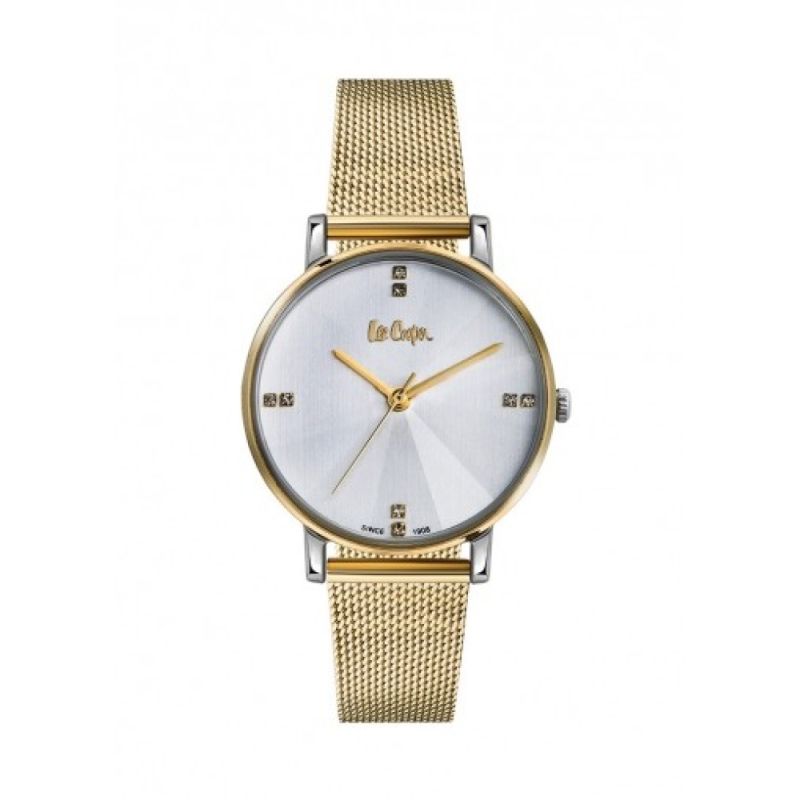 Дамски часовник Lee Cooper от колекцията Elegance. Моделът е със сребрист аналогов дисплей с декорация от нежни кристали. Корпусът е изработен от супер метал и е с минерално стъкло. Верижката е от неръждаема стомана в цвят злато. Задвижва се от кварцов механизъм. Водоустойчивост 3 ATM - допускат се леки пръски, не се препоръчва обилно мокрене.