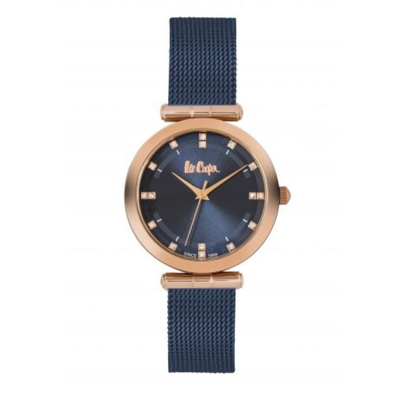 Дамски часовник Lee Cooper от колекцията Elegance. Верижка тип ситна плетка от неръждаема стомана. Корпус изработен от специална сплав - супер метал. Стъкло минерал-кристал. Стилен аналогов дисплей в син цвят с декорация от инкрустирани кристали. Моделът се задвижва от кварцов механизъм. Водоустойчивост 3 ATM - допускат се леки пръски, не се препоръчва обилно мокрене.