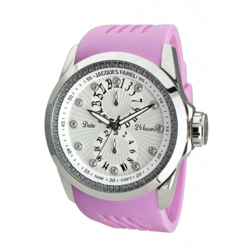 Дамски спортно-елегантен часовник Jacques Farel с декорация от нежни кристали. Моделът е с мултифункционален дисплей. Корпус от неръждаема стомана. Розова силиконова каишка. Минерално стъкло с антирефлексно покритие. Кварцов механизъм. Водоустойчивост 10 ATM - позволява мокрене, къпане и плуване във водни басейни.