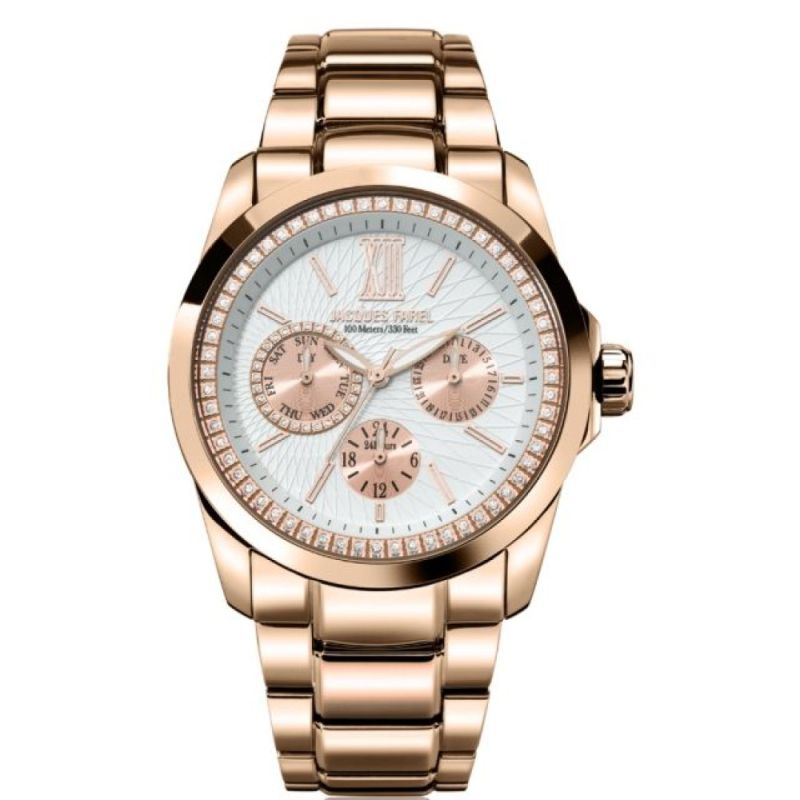 Дамски часовник Jacques Farel със спортно-елегантна визия и декорация от нежни кристали. Моделът е с корпус и верижка от неръждаема стомана в цвят розово злато. Минерално стъкло с антирефлексно покритие. Мултифункционален дисплей с фосфоресцентно покритие на стрелките. Кварцов механизъм. Водоустойчивост 10 ATM - позволява мокрене, къпане и плуване във водни басейни.