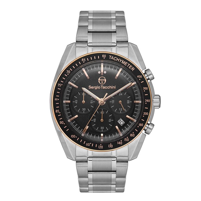 Спортно-елегантен мъжки часовник Sergio Tacchini с дисплей тип хронограф. Корпус и верижка изработени от неръждаема стомана. Минерално стъкло, устойчиво на надраскване. Кварцов механизъм. Водоустойчивост 5 ATM - допускат се леки пръски и взимане на душ, не се препоръчва обилно мокрене.