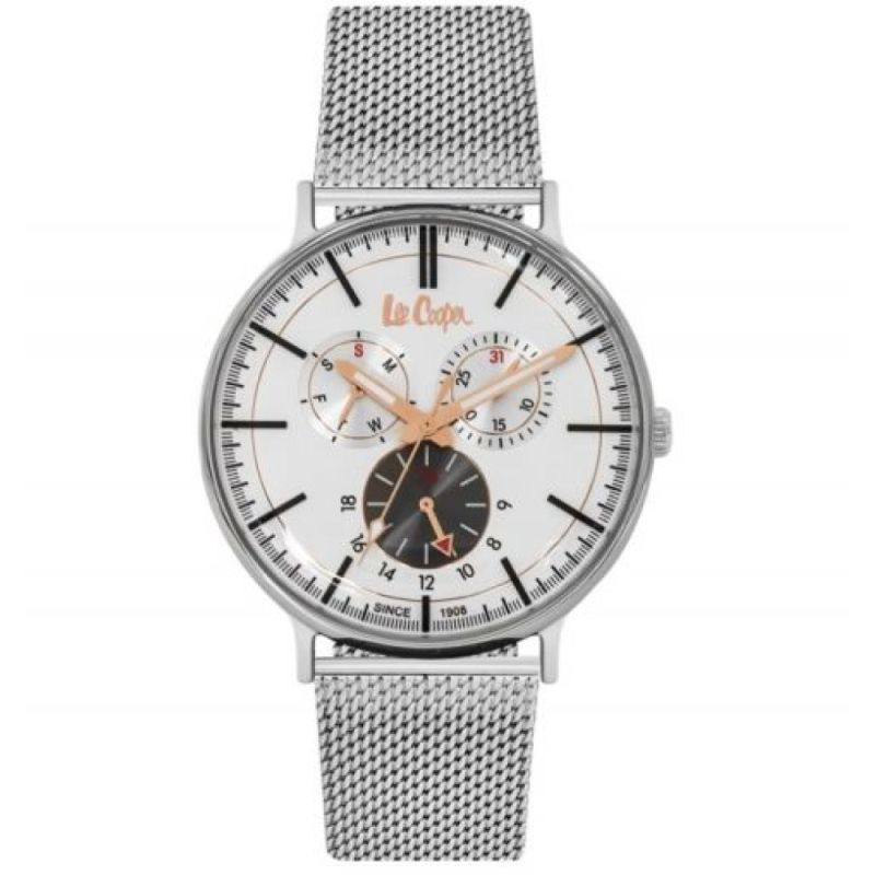 Мъжки часовник Lee Cooper със спортно-елегантна визия. Моделът е с корпус и верижка от супер метал. Стъкло минерал-кристал. Мултифункционален дисплей с показатели за ден от седмицата, дата и 24 часов формат. Задвижва се от кварцов механизъм. Водоустойчивост 3 ATM - допускат се леки пръски, не се препоръчва обилно мокрене.
