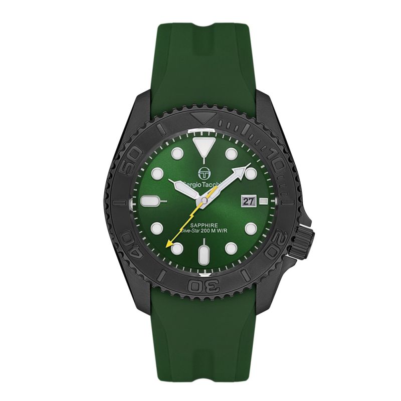 Мъжки часовник Sergio Tacchini с модерна спортна визия от колекцията Dive Star. Корпус от неръждаема стомана в комбинация със силиконова каишка. Зелен аналогов дисплей с показател за дата. Луминисцентно покритие на стрелките и индексите. Стъкло сапфир-кристал. Задвижва се от кварцов механизъм. Водоустойчивост 20 ATM - позволява мокрене, къпане, плуване и гмуркане във водни басейни.