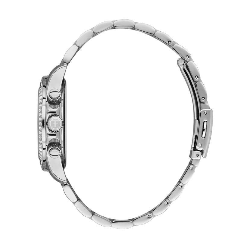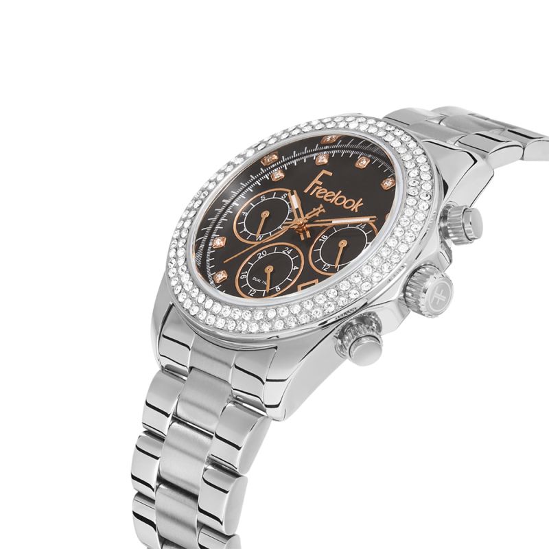 Дамски часовник Freelook от колекцията Charmant. Моделът е със седефен мултифункционален дисплей и богата декорация от нежни кристали. Стъкло минерал-кристал. Метален корпус в комбинация с верижка от неръждаема стомана. Задвижва се от кварцов механизъм. Водоустойчивост 5 ATM - допускат се леки пръски и взимане на душ, не се препоръчва обилно мокрене.