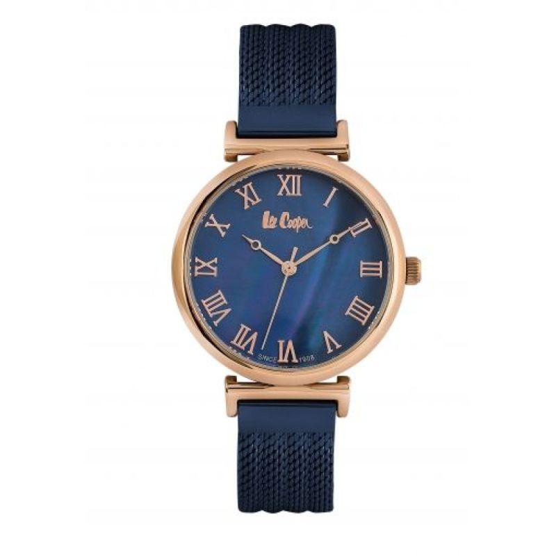 Дамски часовник Lee Cooper от колекцията Elegance. Моделът е с корпус и верижка изработени от специална сплав - супер метал. Стъкло минерал-кристал. Аналогов седефен дисплей в син цвят с розово-златисти стрелки и римски цифри. Задвижва се от кварцов механизъм. Водоустойчивост 3 ATM - допускат се леки пръски, не се препоръчва обилно мокрене.