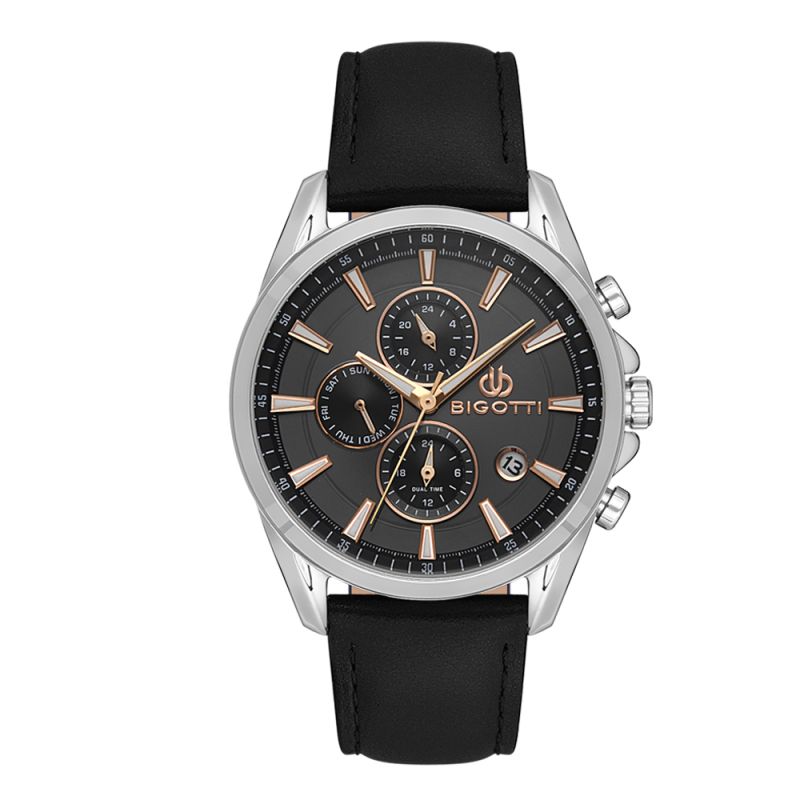 Спортно-елегантен мъжки часовник Bigotti с мултифункционален дисплей. Метален корпус в комбинация с кожена каишка. Минерално стъкло, устойчиво на надраскване. Моделът се задвижва от кварцов механизъм. Водоустойчивост 5 ATM - допускат се леки пръски и взимане на душ, не се препоръчва обилно мокрене.