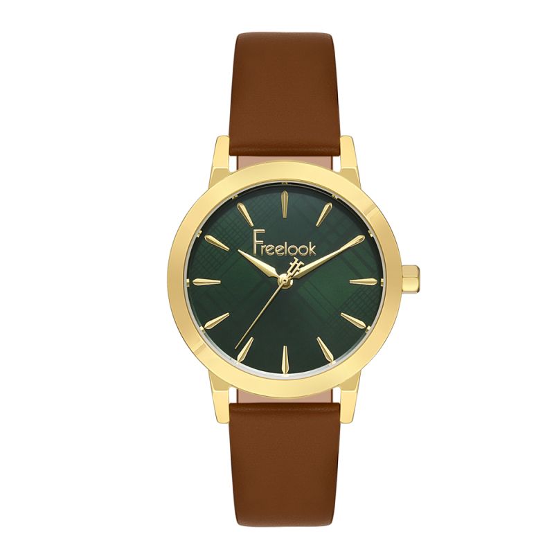 Дамски часовник Freelook с метален корпус и каишка от естествена кожа. Зелен аналогов дисплей. Стъкло минерал-кристал. Задвижва се от кварцов механизъм. Водоустойчивост 5 ATM - допускат се леки пръски и взимане на душ, не се препоръчва обилно мокрене.