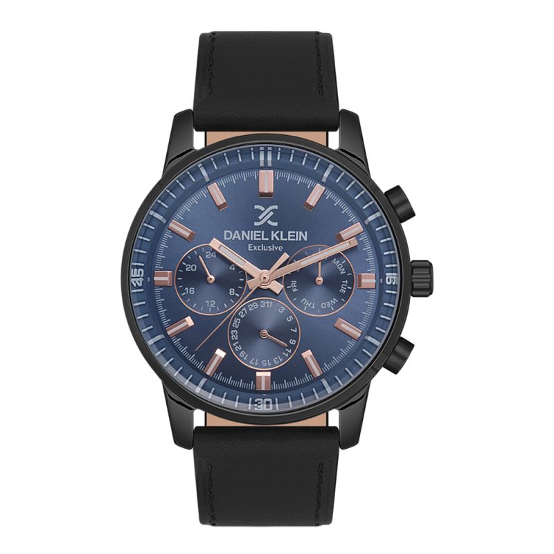 Спортно-елегантен мъжки часовник Daniel Klein с мултифункционален дисплей от колекцията Exclusive. Метален корпус, съчетан с кожена каишка. Минерално стъкло устойчиво към надраскване. Задвижва се от кварцов механизъм. Водоустойчивост 5 ATM - допускат се леки пръски и взимане на душ, не се препоръчва обилно мокрене.