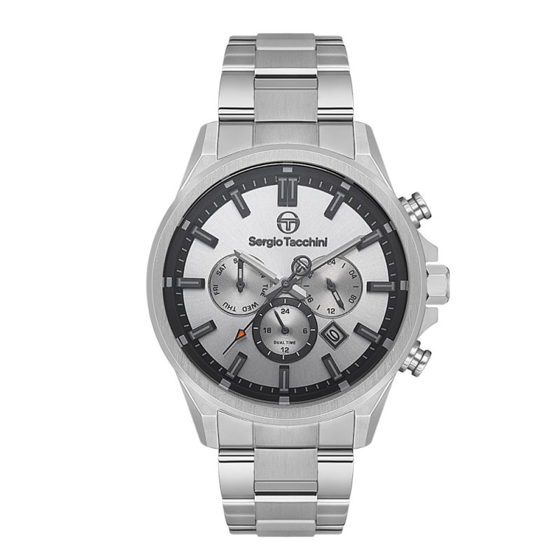 Мъжки часовник Sergio Tacchini със спортно-ежедневна визия. Сребрист мултифункционален дисплей с детайли в черен цвят. Минерално стъкло, устойчиво на надраскване. Моделът е с корпус и верижка от неръждаема стомана. Задвижва се от кварцов механизъм. Водоустойчивост 5 ATM - допускат се леки пръски и взимане на душ, не се препоръчва обилно мокрене.
