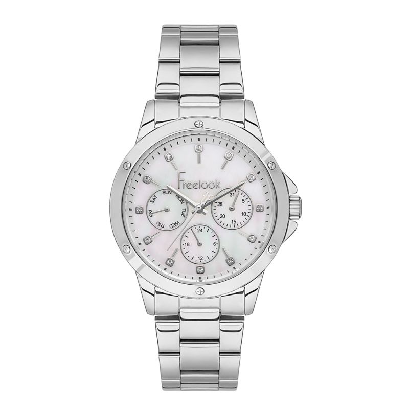 Спортно-елегантен дамски часовник Freelook от колекцията Jolie. Седефен мултифункционален дисплей с декорация от крисали. Стъкло минерал-кристал. Моделът е с метален корпус и верижка от неръждаема стомана. Задвижва се от кварцов механизъм. Водоустойчивост 5 ATM - допускат се леки пръски и взимане на душ, не се препоръчва обилно мокрене.