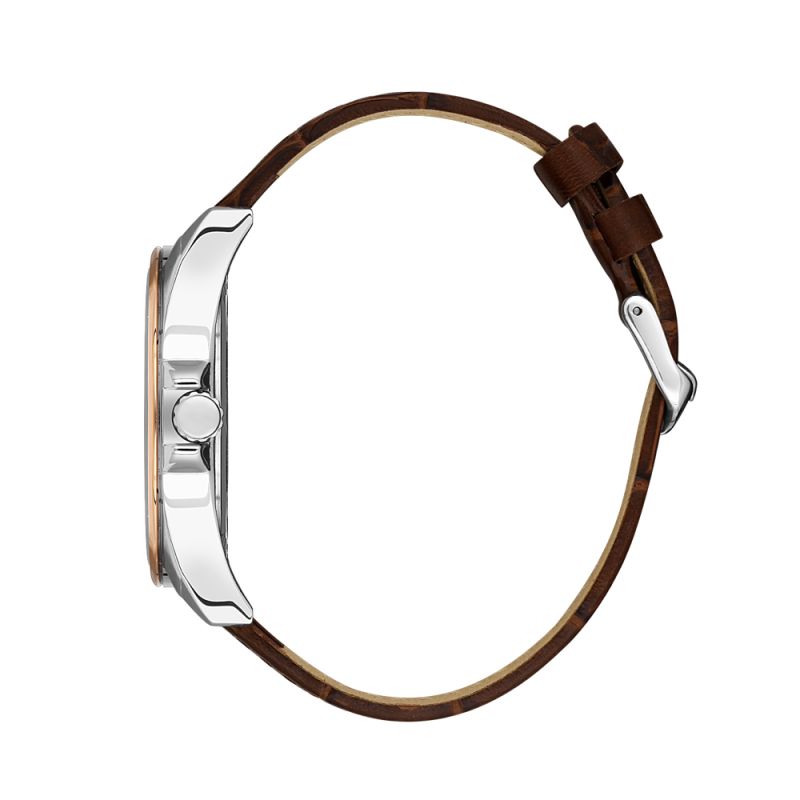 Стилен мъжки часовник Bigotti с метален корпус и каишка от естествена кожа. Кафяв аналогов дисплей с детайли в цвят розово злато и показател за дата. Минерално стъкло, устойчиво на надраскване. Кварцов механизъм. Водоустойчивост 5 ATM - допускат се леки пръски и взимане на душ, не се препоръчва обилно мокрене.