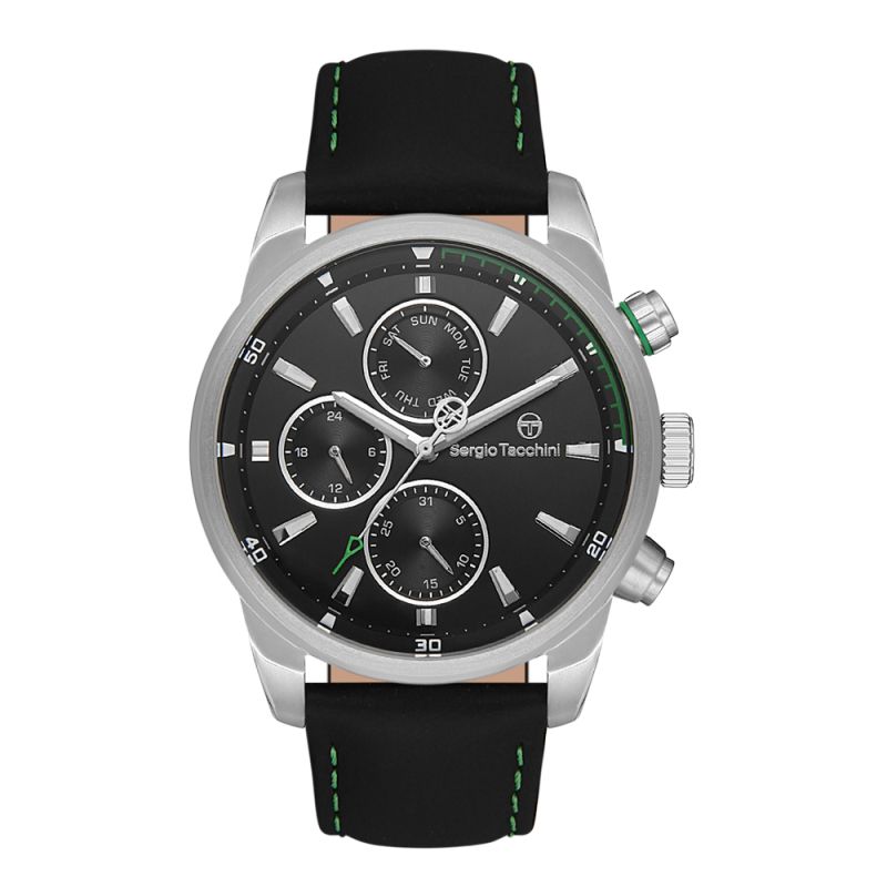 Спортно-елегантен мъжки часовник Sergio Tacchini. Мултифункционален дисплей с показатели за дата, ден и 24 часов формат. Корпус от неръждаема стомана в комбинация с каишка от естествена кожа. Кварцов механизъм. Водоустойчивост 5 ATM - допускат се леки пръски и взимане на душ, не се препоръчва обилно мокрене.