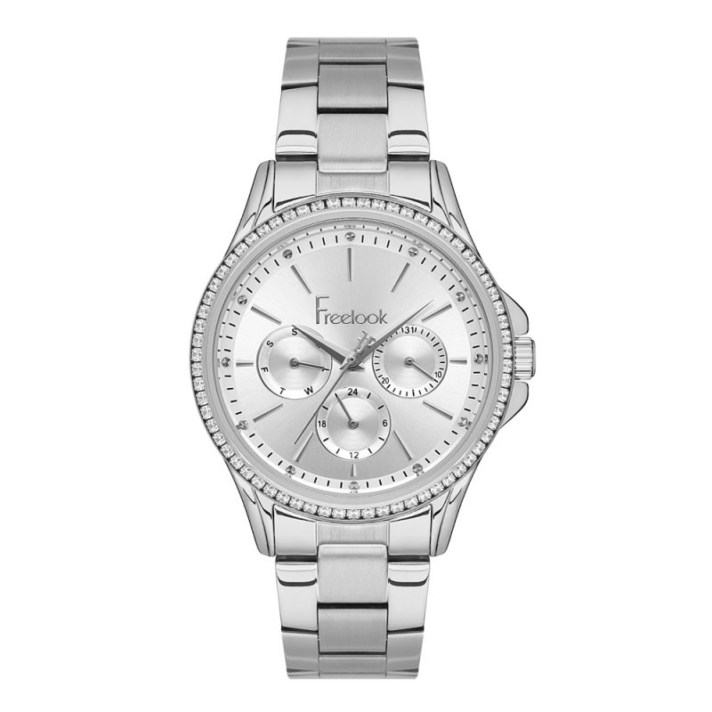 Дамски часовник Freelook с мултифункционален дисплей от серията Lumiere. Моделът е с нежна декорация от кристали. Метален корпус в комбинация с верижка от неръждаема стомана. Стъкло минерал-кристал. Задвижва се от кварцов механизъм. Водоустойчивост 5 ATM - допускат се леки пръски и взимане на душ, не се препоръчва обилно мокрене.