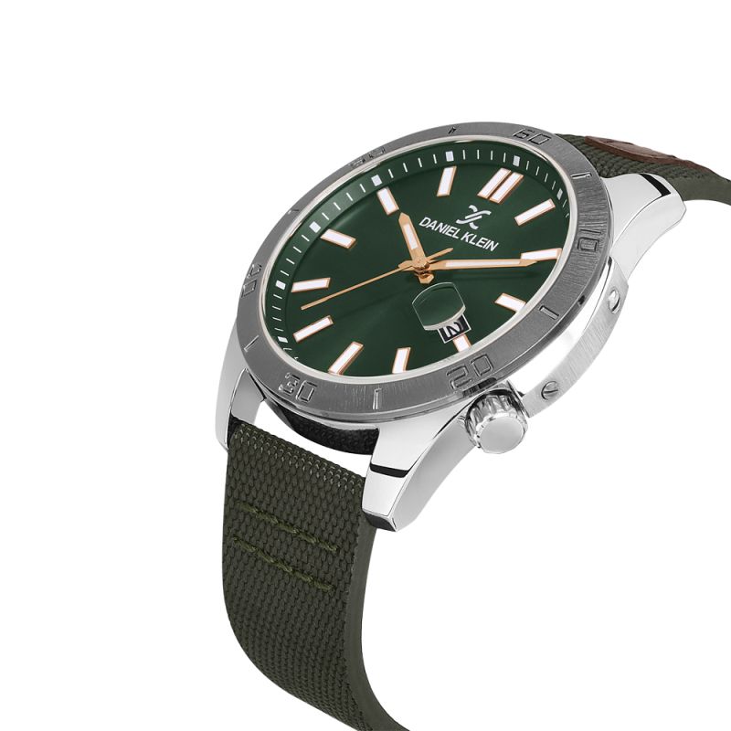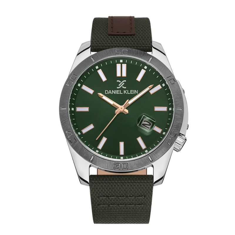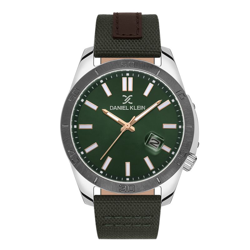 Спортно-елегантен мъжки часовник Daniel Klein от колекцията Premium. Корпус изработен от висококачествена метална сплав. Каишка в комбинация от естествена кожа и текстил. Тъмнозелен аналогов дисплей с показател за дата. Луминисцентно покритие на стрелките и индексите. Стъкло минерал-кристал. Задвижва се от кварцов механизъм. Водоустойчивост 5 ATM - допускат се леки пръски и взимане на душ, не се препоръчва обилно мокрене.