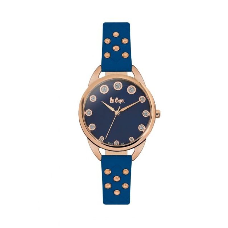 Дамски часовник Lee Cooper от колекцията Elegance. Корпус изработен от специална сплав - супер метал. Стъкло минерал-кристал. Синя кожена каишка с метални акценти. Аналогов дисплей с декорация от блестящи елементи на часовите маркери. Кварцов механизъм. Водоустойчивост 3 ATM - допускат се леки пръски, не се препоръчва обилно мокрене.