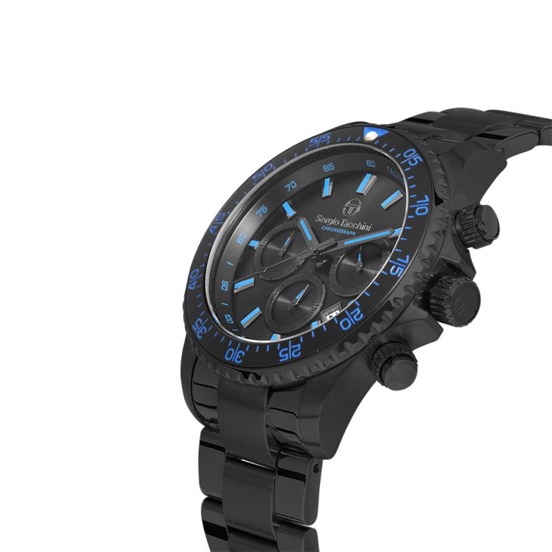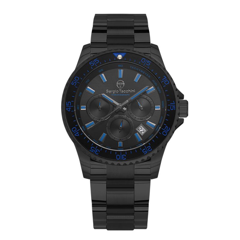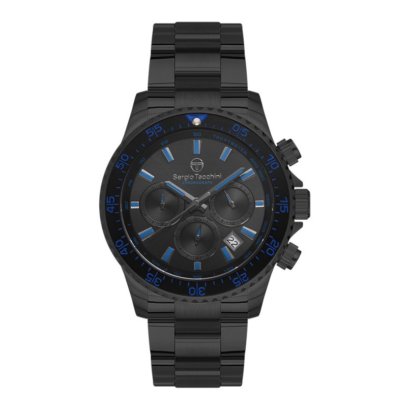 Спортно-елегантен мъжки часовник Sergio Tacchini с модерна визия. Моделът е с корпус и верижка от неръждаема стомана. Дисплеят е черен хронограф със сини детайли. Минерално стъкло, устойчиво на надраскване. Задвижва се от кварцов механизъм. Водоустойчивост 5 ATM - допускат се леки пръски и взимане на душ, не се препоръчва обилно мокрене.