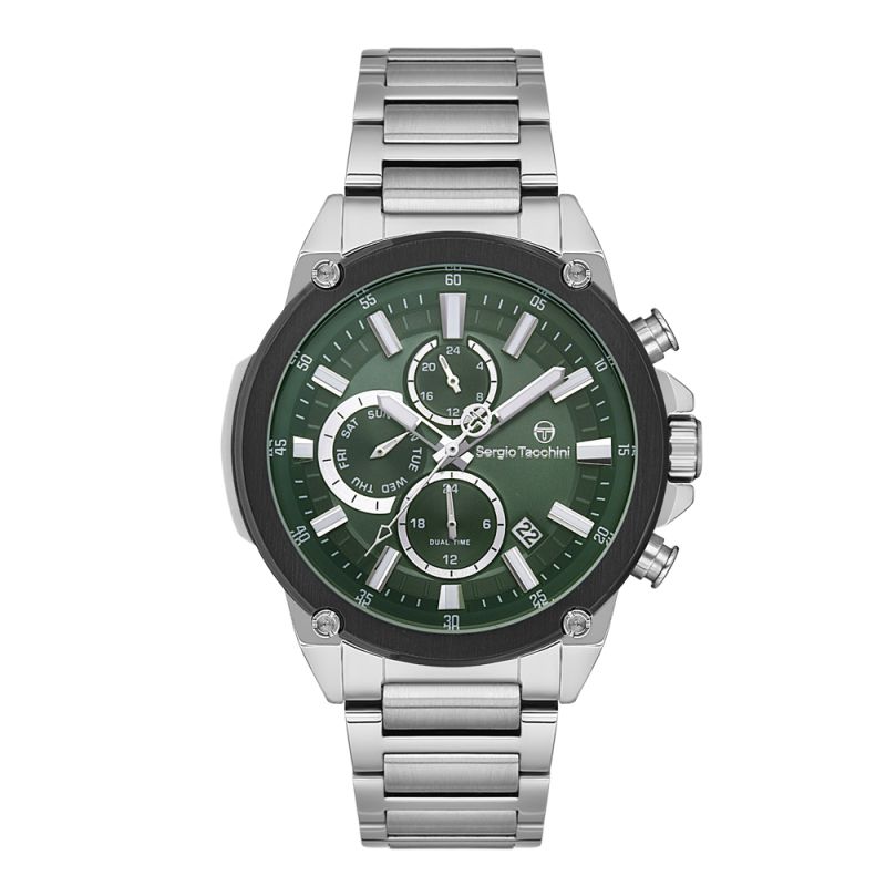 Мъжки часовник Sergio Tacchini с мултифункционален дисплей. Моделът е с корпус и верижка изработени от неръждаема стомана. Минерално стъкло, устойчиво на надраскване. Задвижва се от кварцов механизъм. Водоустойчивост 5 ATM - допускат се леки пръски и взимане на душ, не се препоръчва обилно мокрене.