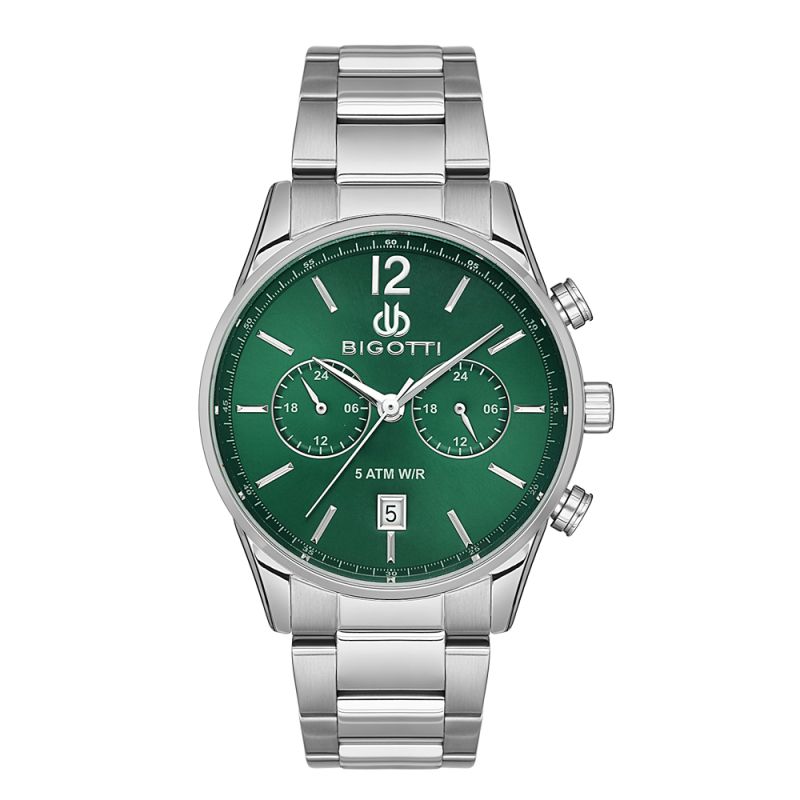 Спортно-елегантен мъжки часовник Bigotti. Зелен мултифункционален дисплей със сребристи детайли и показатели за двойно време и дата. Минерално стъкло, устойчиво на надраскване. Моделът е с метален корпус и верижка от неръждаема стомана. Задвижва се от кварцов механизъм. Водоустойчивост 5 ATM - допускат се леки пръски и взимане на душ, не се препоръчва обилно мокрене.