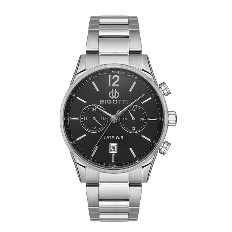 Спортно-елегантен мъжки часовник Bigotti. Черен мултифункционален дисплей със сребристи детайли и показатели за двойно време и дата. Минерално стъкло, устойчиво на надраскване. Моделът е с метален корпус и верижка от неръждаема стомана. Задвижва се от кварцов механизъм. Водоустойчивост 5 ATM - допускат се леки пръски и взимане на душ, не се препоръчва обилно мокрене.