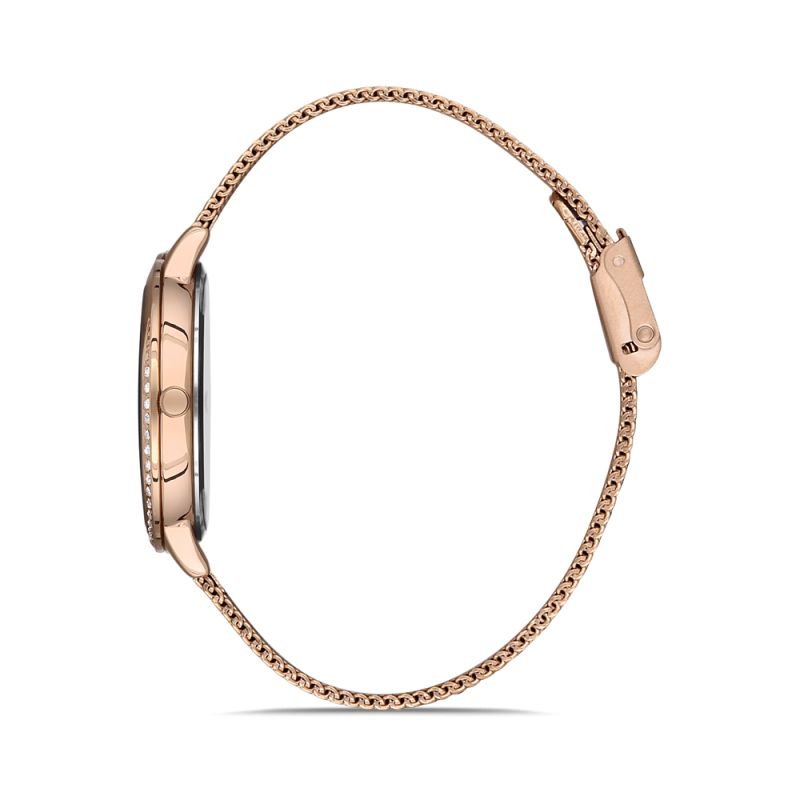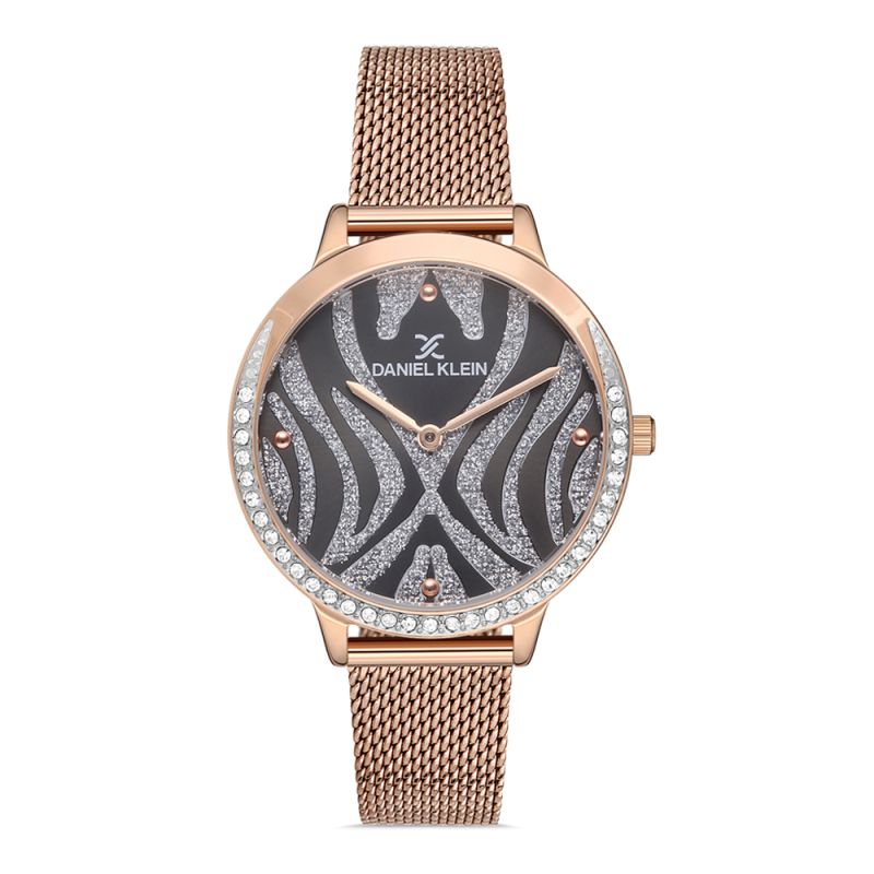 Дамски часовник Daniel Klein с модерен и интересен дизайн от колекцията Premium. Моделът е с меш верижка от неръждаема стомана и метален корпус. Черен аналогов дисплей с бляскави детайли и частична декорация от нежни кристали по безела. Стъкло минерал-кристал. Кварцов механизъм. Водоустойчивост 3 ATM - допускат се леки пръски, не се препоръчва обилно мокрене.