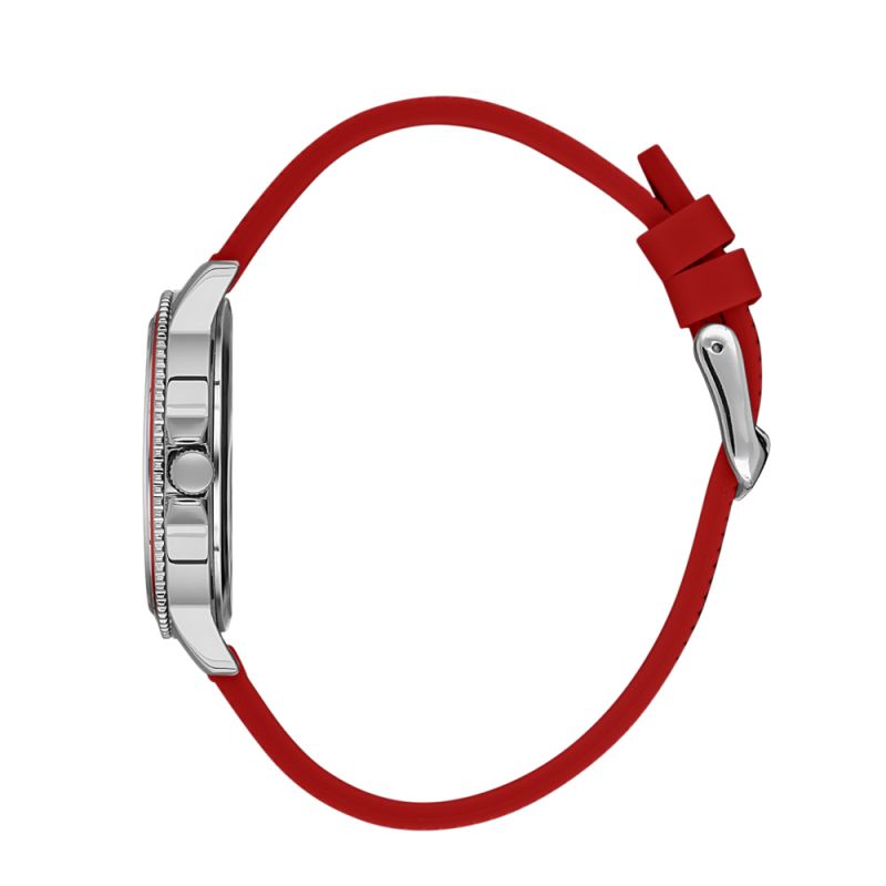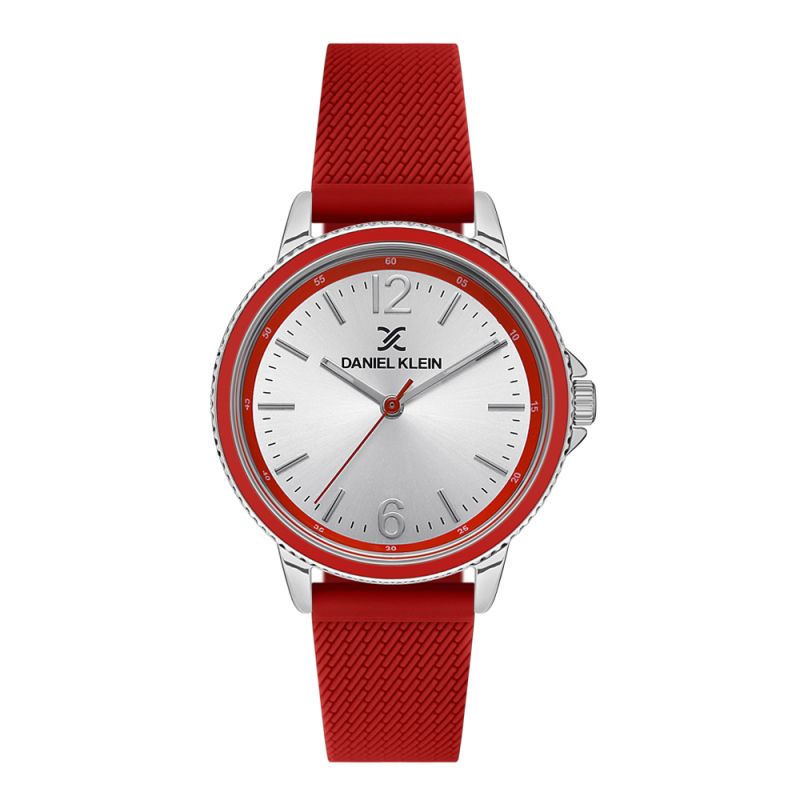 Дамски часовник Daniel Klein със спортно-ежедневен дизайн от колекцията Premium. Моделът е с метален корпус и червена силиконова каишка. Сребрист аналогов дисплей. Стъкло минерал-кристал. Задвижва се от кварцов механизъм. Водоустойчивост 3 ATM - допускат се леки пръски, не се препоръчва обилно мокрене.