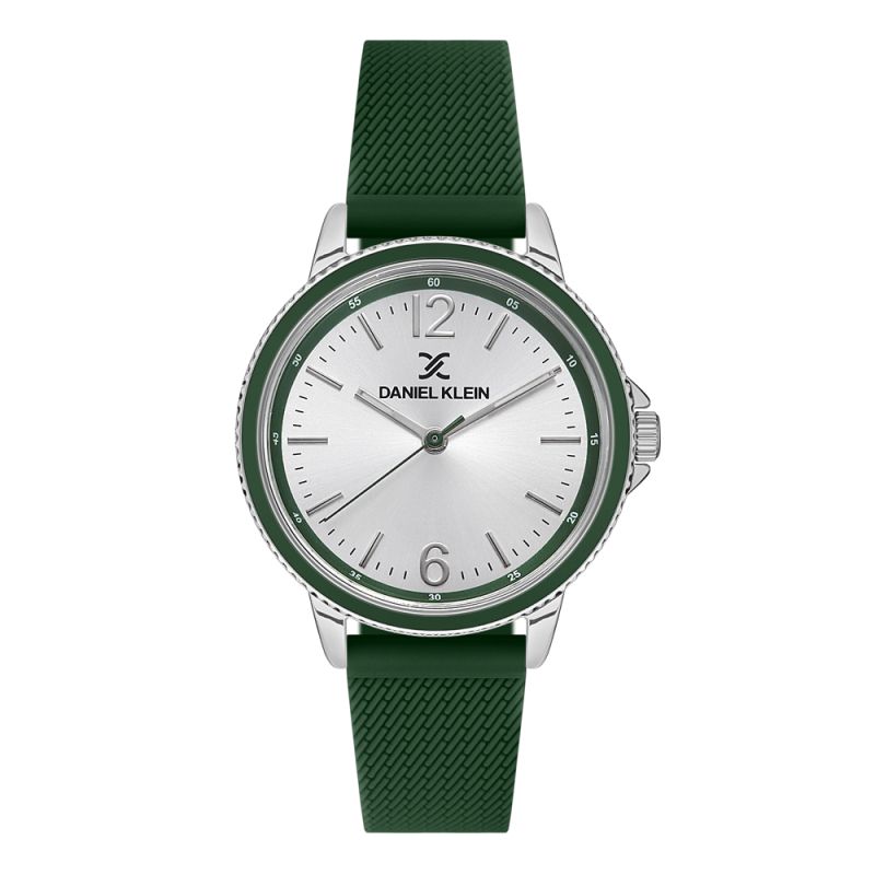 Дамски часовник Daniel Klein със спортно-ежедневен дизайн от колекцията Premium. Моделът е с метален корпус и зелена силиконова каишка. Сребрист аналогов дисплей. Стъкло минерал-кристал. Задвижва се от кварцов механизъм. Водоустойчивост 3 ATM - допускат се леки пръски, не се препоръчва обилно мокрене.