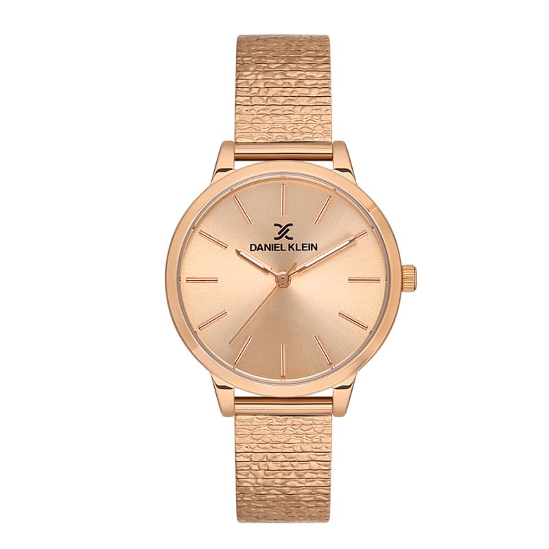 Спортно-елегантен дамски часовник Daniel Klein от колекцията Premium. Моделът е с метален корпус и верижка от неръждаема стомана. Дисплеят е аналогов в цвят розово злато. Стъклото е минерал-кристал. Задвижва се от кварцов механизъм. Водоустойчивост 3 ATM - допускат се леки пръски, не се препоръчва обилно мокрене.