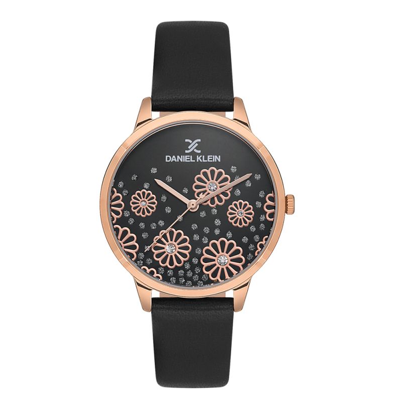 Дамски часовник Daniel Klein с впечатляваща и модерна визия от колекцията Premium. Аналогов дисплей с нежна флорална декорация и бляскави детайли. Стъкло минерал-кристал. Корпус изработен от висококачествена метална сплав. Каишка от естествена кожа. Кварцов механизъм. Водоустойчивост 3 ATM - допускат се леки пръски, не се препоръчва обилно мокрене.