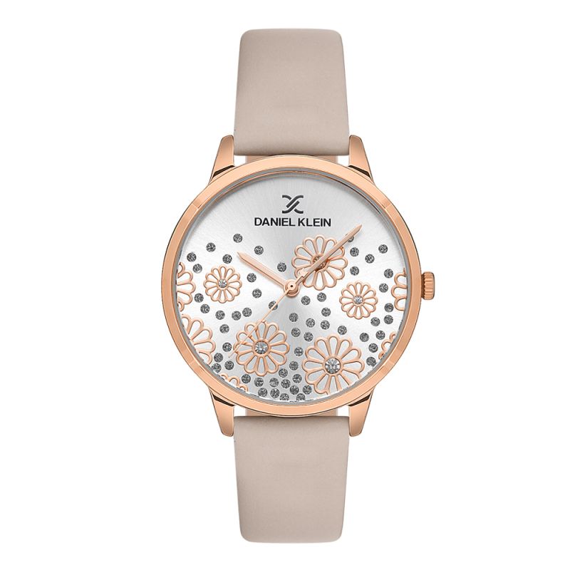 Дамски часовник Daniel Klein с впечатляваща и модерна визия от колекцията Premium. Аналогов дисплей с нежна флорална декорация и бляскави детайли. Стъкло минерал-кристал. Корпус изработен от висококачествена метална сплав. Каишка от естествена кожа. Кварцов механизъм. Водоустойчивост 3 ATM - допускат се леки пръски, не се препоръчва обилно мокрене.