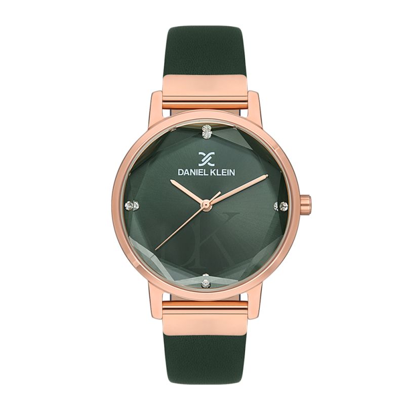Елегантен дамски часовник Daniel Klein от колекцията Premium. Аналогов дисплей в масленозелен цвят с изчистен дизайн и декорация от четири кристала. Стъкло минерал-кристал. Метален корпус съчетан с каишка от естествена кожа. Кварцов механизъм. Водоустойчивост 3 ATM - допускат се леки пръски, не се препоръчва обилно мокрене.