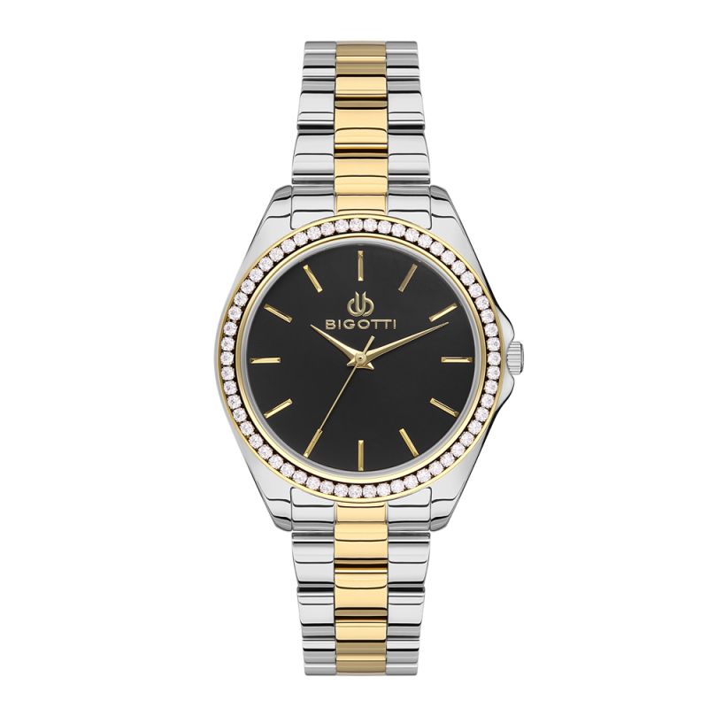 Класически модел дамски часовник Bigotti с нежна декорация от кристали по безела. Черен аналогов дисплей със златисти стрелки и индекси. Минерално стъкло, устойчиво на надраскване. Метален корпус в комбинация с верижка от неръждаема стомана. Моделът се задвижва от кварцов механизъм. Водоустойчивост 3 ATM - допускат се леки пръски, не се препоръчва обилно мокрене.