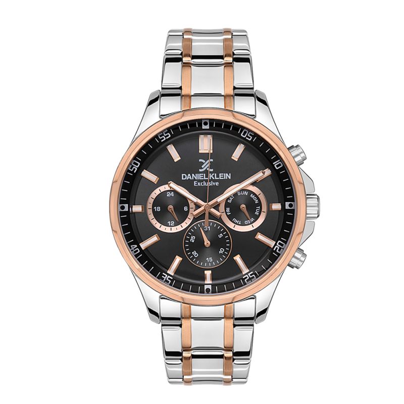 Мъжки часовник Daniel Klein с мултифункционален дисплей от колекцията Exclusive. Моделът е с метален корпус и верижка от неръждаема стомана. Минерално стъкло устойчиво към надраскване. Задвижва се от кварцов механизъм. Водоустойчивост 5 ATM - допускат се леки пръски и взимане на душ, не се препоръчва обилно мокрене.