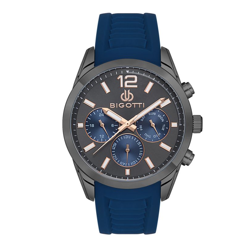 Спортен модел мъжки часовник Bigotti с мултифункционален дисплей. Минерално стъкло, устойчиво на надраскване. Метален корпус в комбинация със силиконова каишка. Задвижва се от кварцов механизъм. Водоустойчивост 5 ATM - допускат се леки пръски и взимане на душ, не се препоръчва обилно мокрене.