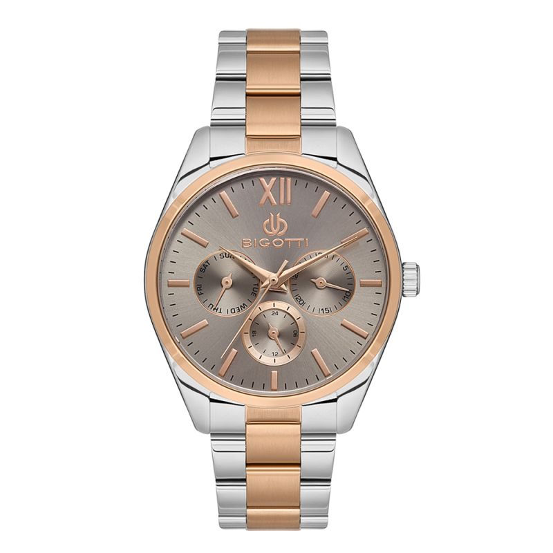 Дамски часовник Bigotti със спортно-ежедневен дизайн. Моделът е със сив мултифункционален дисплей с детайли в цвят розово злато. Стъкло минерал-кристал. Метален корпус в комбинация с верижка от неръждаема стомана. Задвижва се от кварцов механизъм. Водоустойчивост 3 ATM - допускат се леки пръски, не се препоръчва обилно мокрене.