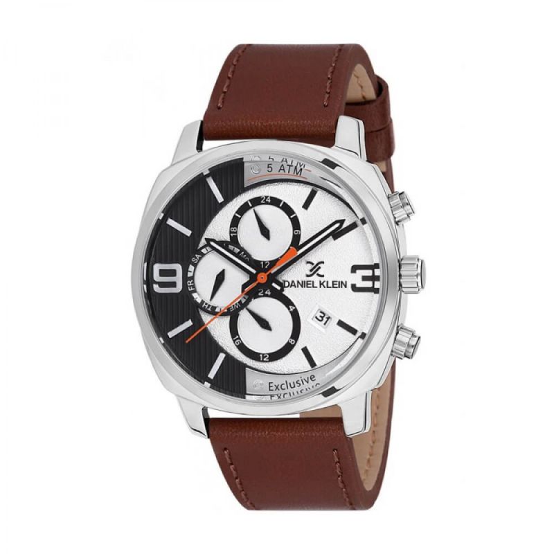 Модерен спортно-елегантен мъжки часовник Daniel Klein с мултифункционален дисплей от колекцията Exclusive. Стъкло минерал-кристал. Корпус от висококачествен метал, съчетан с кафява кожена каишка. Задвижва се от кварцов механизъм. Водоустойчивост 5 ATM - допускат се леки пръски и взимане на душ, не се препоръчва обилно мокрене.