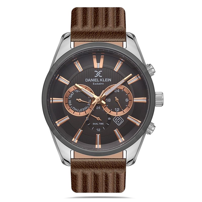 Мъжки часовник Daniel Klein с мултифункционален дисплей от колекцията Exclusive. Моделът е с корпус от метал и кафява каишка от естествена кожа. Стъкло минерал-кристал. Кварцов механизъм. Водоустойчивост 5 ATM - допускат се леки пръски и взимане на душ, не се препоръчва обилно мокрене.